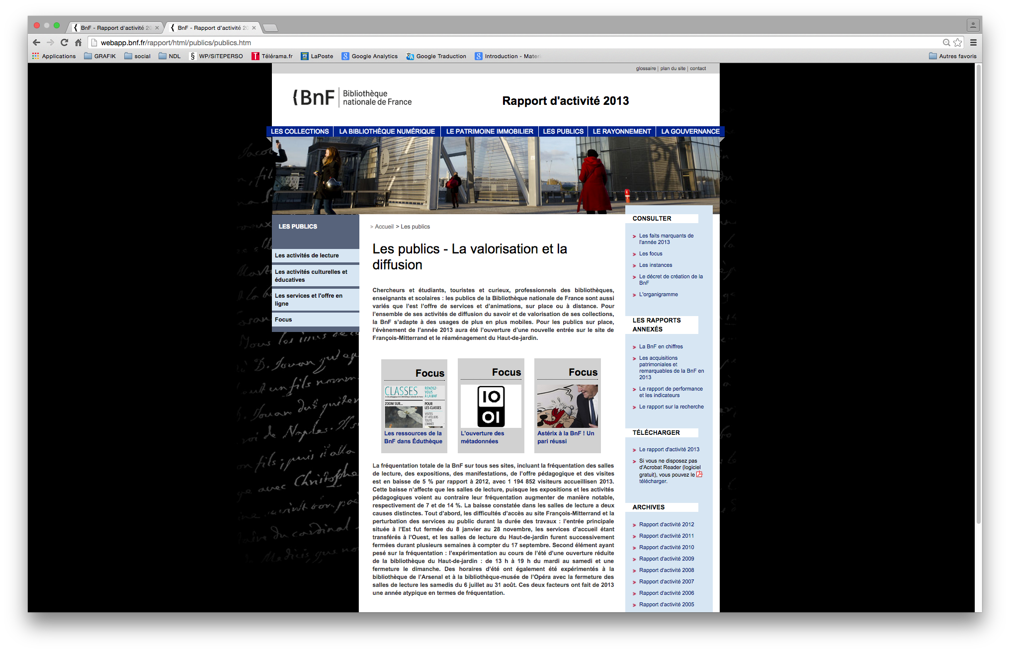 La demande consistait en la refonte graphique du site de diffusion des rapports d’activité de la BnF, tout en restant dans la structure globale du site, à laquelle je ne devais pas toucher (ces pages étant « insérées » dans le site mère, et le contenu des années antérieures ne devant pas être modifié). Mon intervention a consisté en une clarification drastique. J’ai axé sur la lisibilité et la fonctionnalité des éléments, l’utilisation optimale de menus déroulants, de textes « accordéons » pour simplifier la lecture globale. Recherche d’une meilleur lisibilité / typo / taille des caractères / gestion du texte en fer à gauche au lieu du pavé, etc…