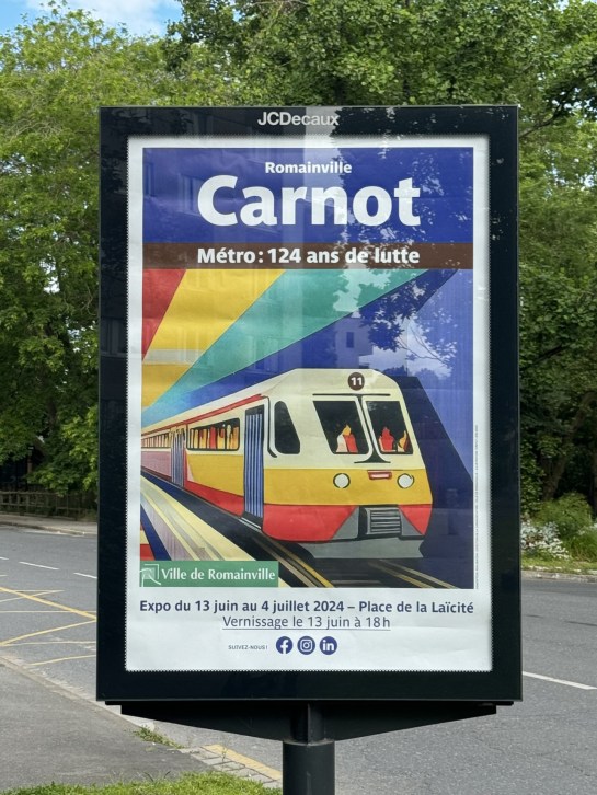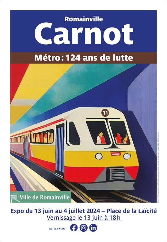 Exposition Romainville Carnot / Métro : 124 ans de lutte, une exposition conçue par la ville de Romainville à l’occasion de l’arrivée du métro 11 Place Carnot. Conception graphique de l’ensemble des supports de communication de l’évènement : affiches, invitations, cartes postales, magnets, posts réseaux sociaux.
