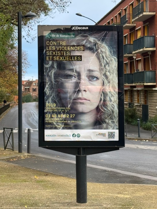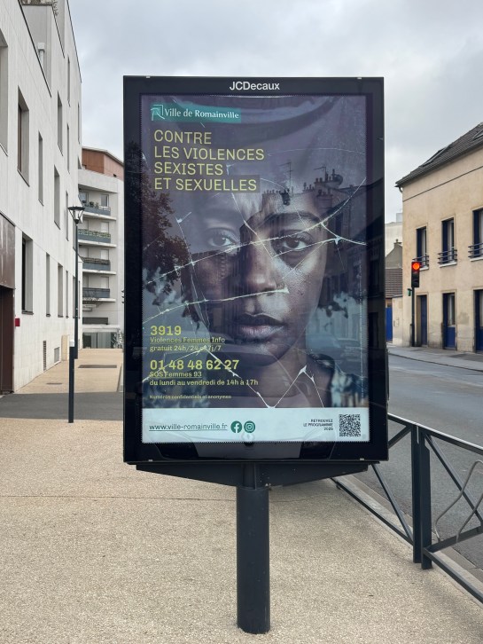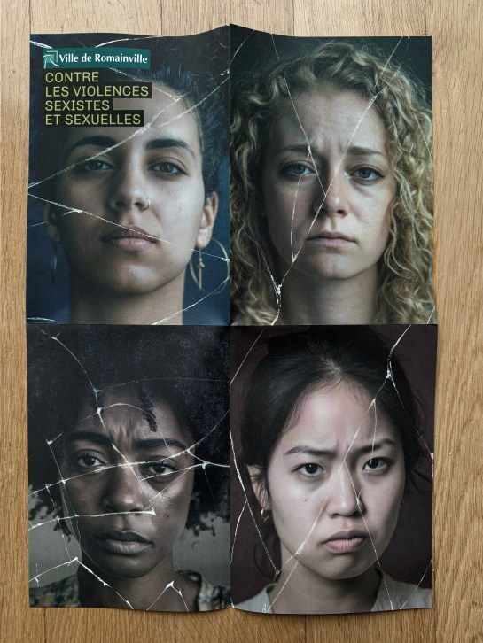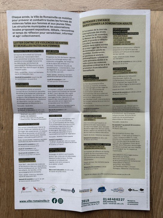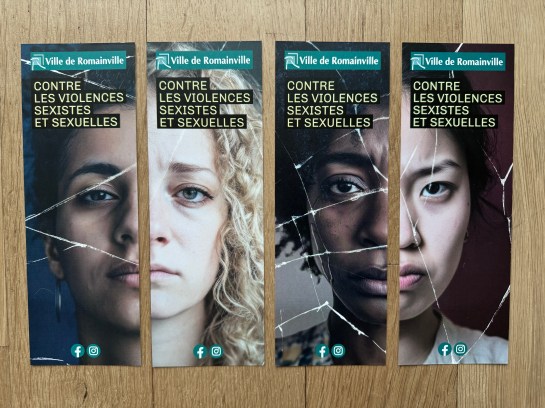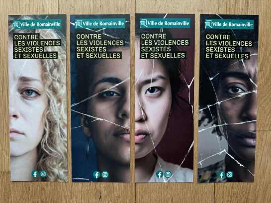Conception de tous les documents de communication de la campagne « Romainville contre les violences sexistes et sexuelles ». Affiches Seniors 120 x 176, Decaux 8m2, marques pages et programme 40 x 60.